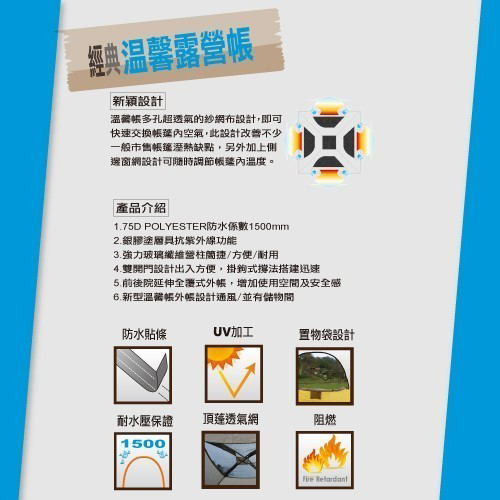 一般帳篷主要由內帳、外帳、營釘營柱營繩組成。 以下將大略說明功能與作用. 外帳是帳篷的保護層也是防雨層.一般帳篷外帳都是在面料上加上一層防水塗層。塗層的厚度和質地決定帳篷的防雨性能,也決定你在戶外活動中遇到雨雪天氣 的保護與休眠品質相對的與輕量化重量也有關係. 最常見的帳篷塗層是PU塗層,PU是聚胺酯高分子有機物...